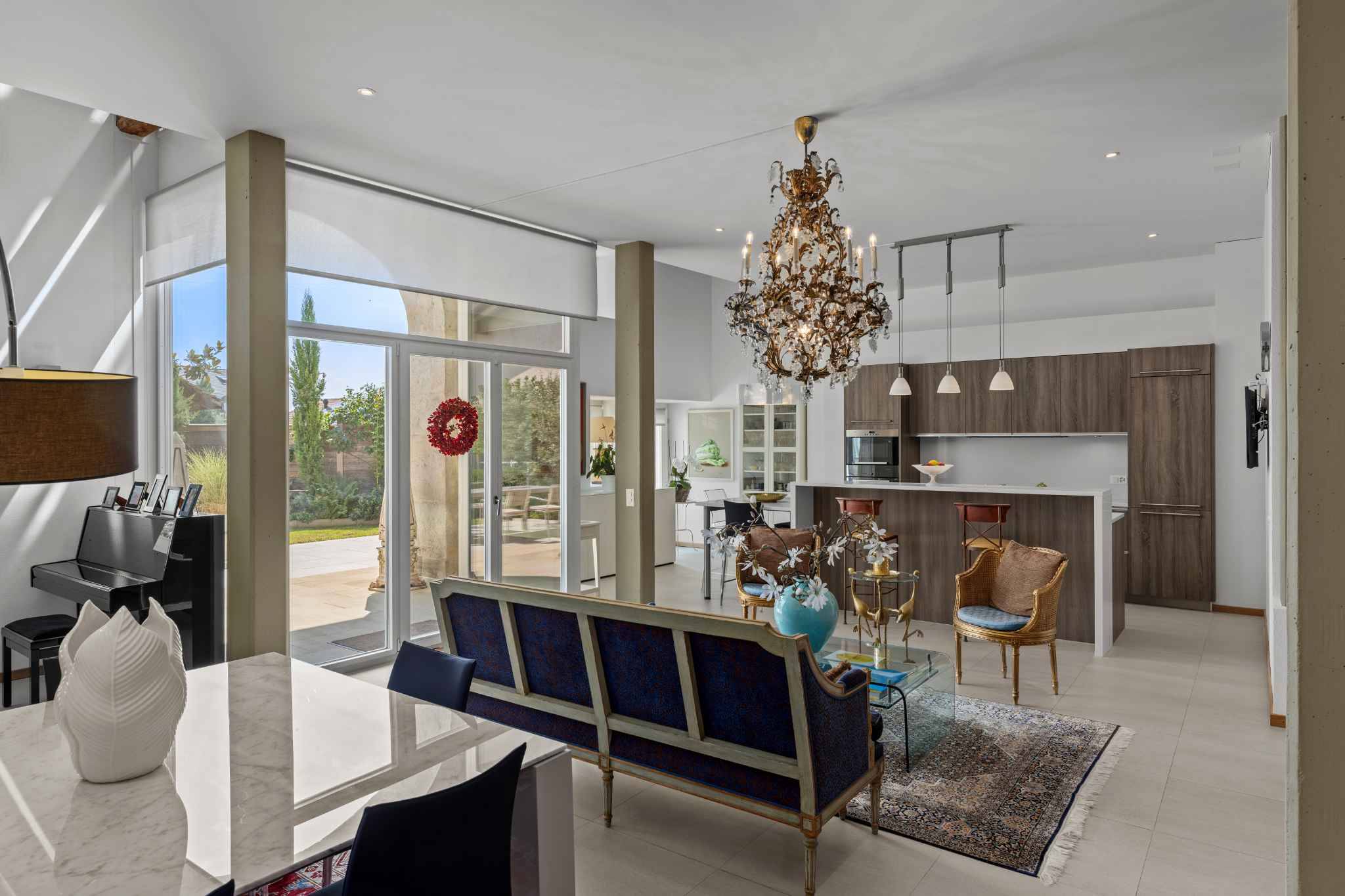 Les espaces de vie sont spacieux et chaleureux : deux salons séparés par une cheminée double face, une salle à manger lumineuse et un bureau, parfait pour le télétravail ou les devoirs. La cuisine contemporaine, entièrement équipée, avec îlot central, est pensée comme un véritable lieu de partage. Elle s’ouvre directement sur la terrasse et le jardin, facilitant la vie quotidienne et les moments en famille.