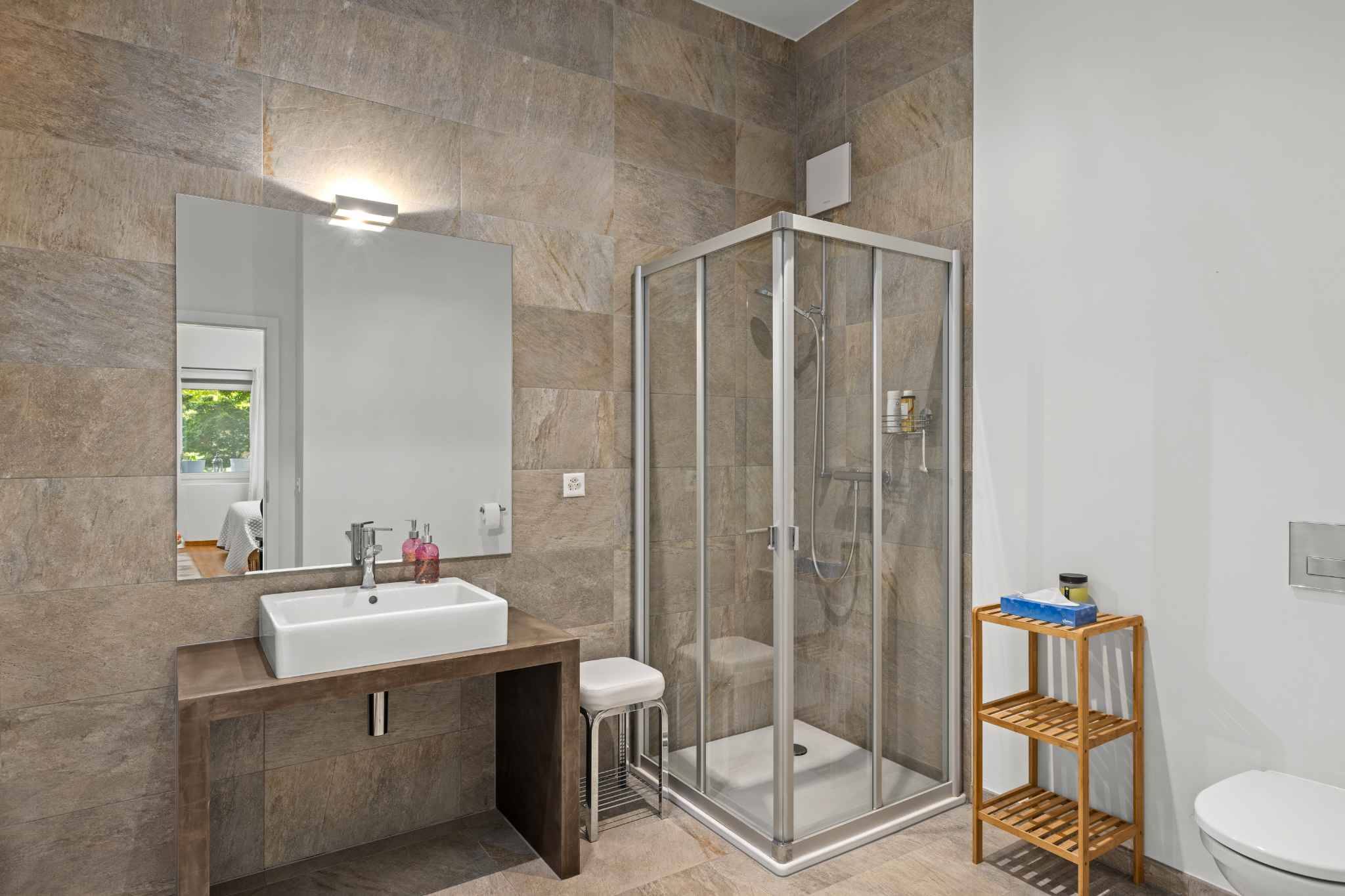 La maison dispose de 4 chambres à coucher, toutes en suites avec salles de bains, offrant à chacun son espace. La suite parentale bénéficie d’un dressing, d’une salle de bains confortable et d’une vue dégagée sur le lac et les toits du village. Un cadre paisible, propice au repos.