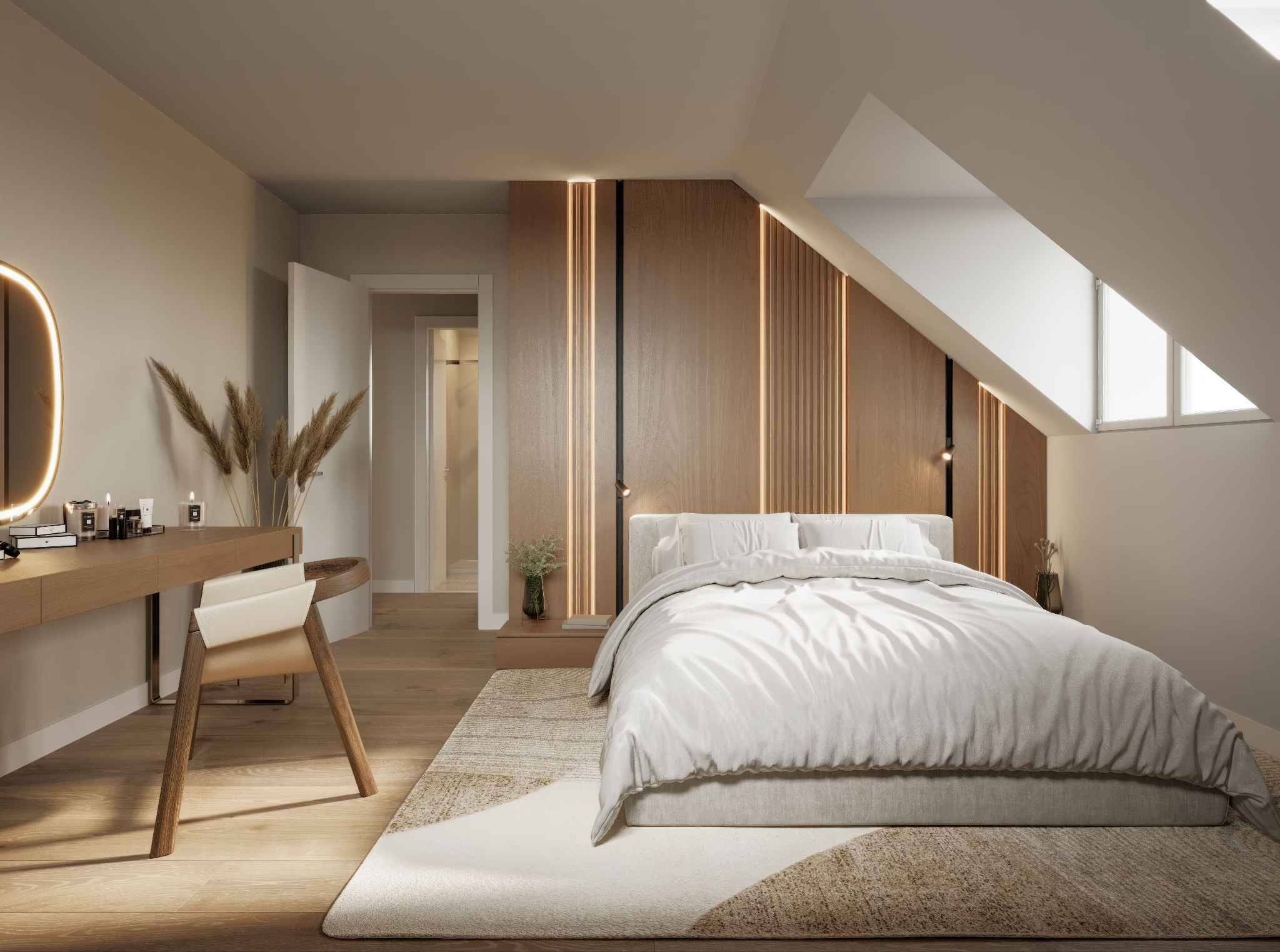 La distribution intérieure a été pensée pour offrir de vastes espaces de vie, fonctionnels et lumineux. Au rez-de-chaussée, un spacieux hall d’entrée mène à un bureau (pouvant également faire office de chambre), un WC visiteurs, une grande cuisine haut de gamme de 17.35 m², ainsi qu’un vaste séjour/salle à manger de 55.56 m², s’ouvrant sur une terrasse dallée et le jardin.
