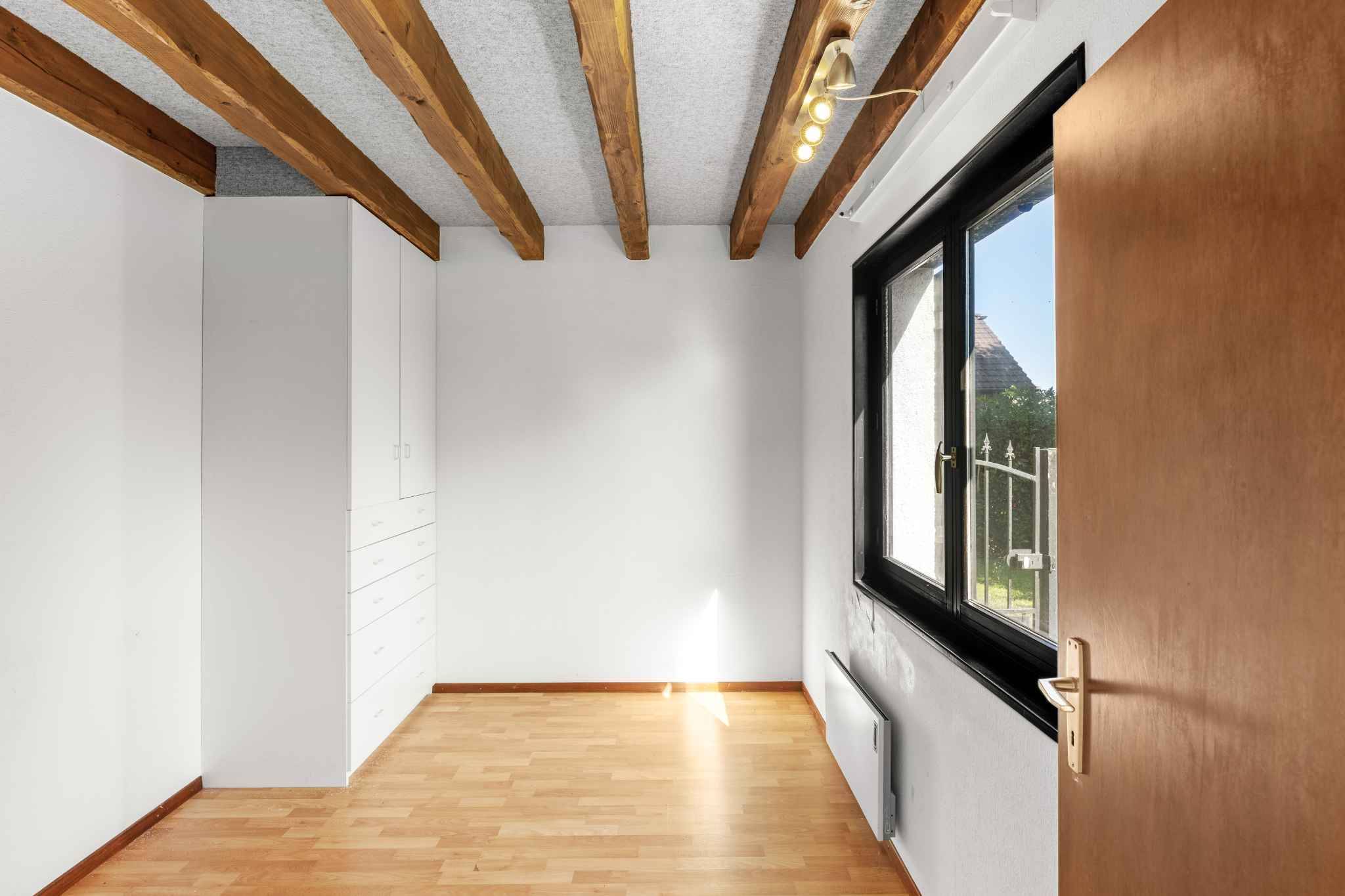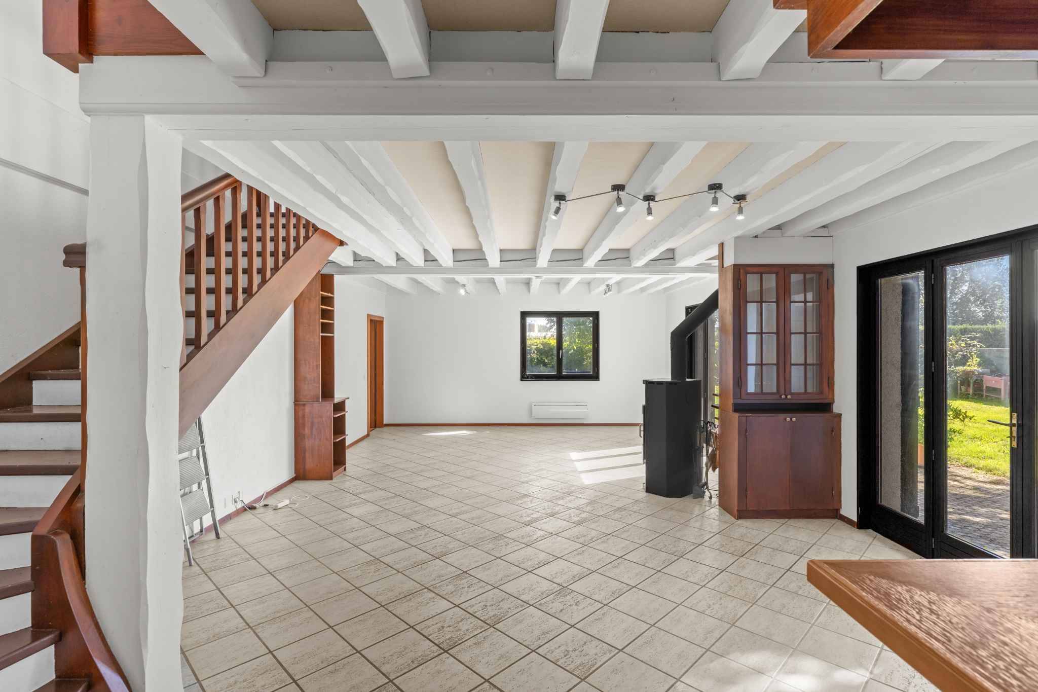 Le séjour, véritable cœur de la maison, séduit par ses poutres apparentes qui apportent du cachet, et sa belle exposition plein sud qui garantit une luminosité naturelle tout au long de la journée. Cet espace de vie chaleureux invite autant à la détente qu’aux moments de convivialité en famille ou entre amis.