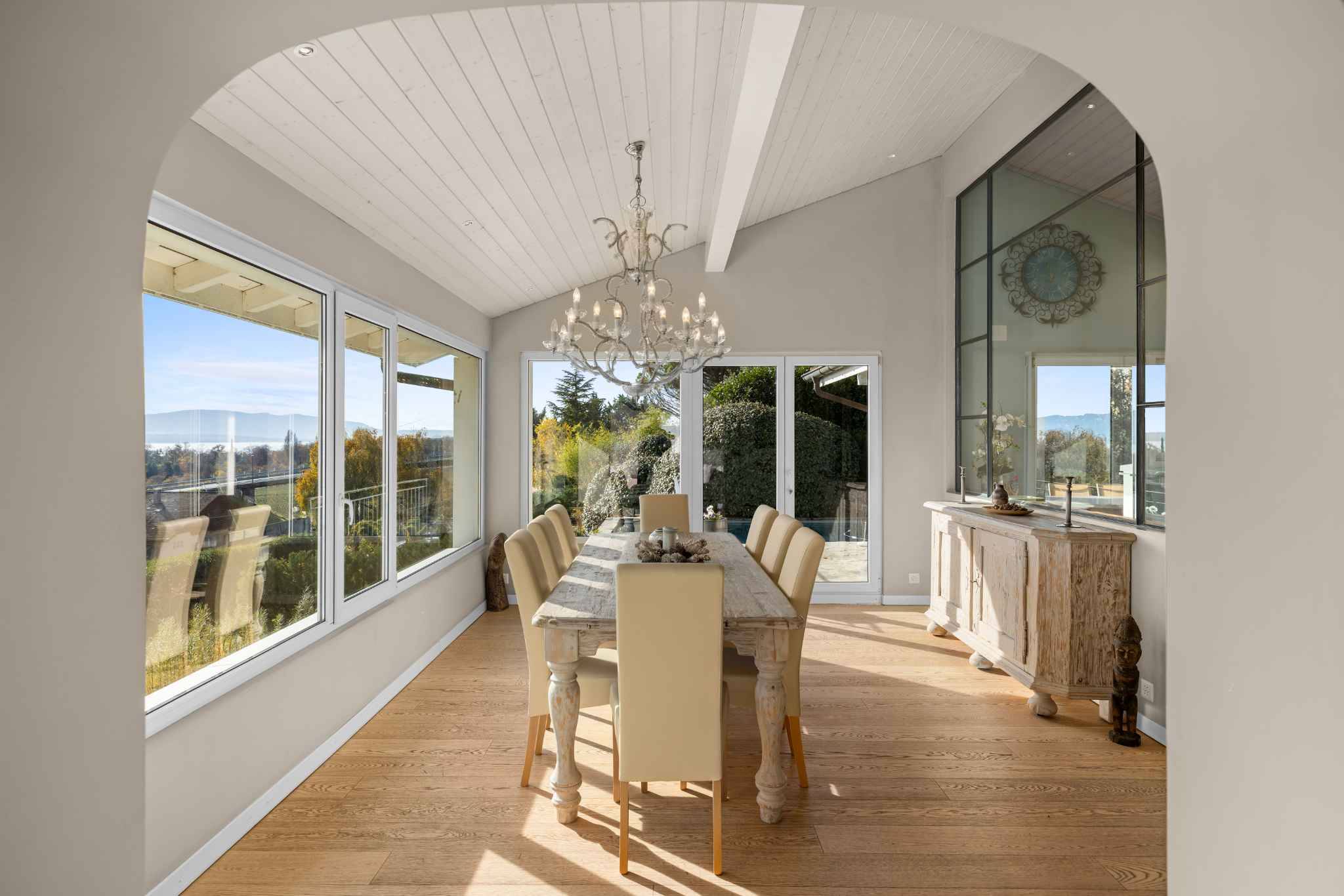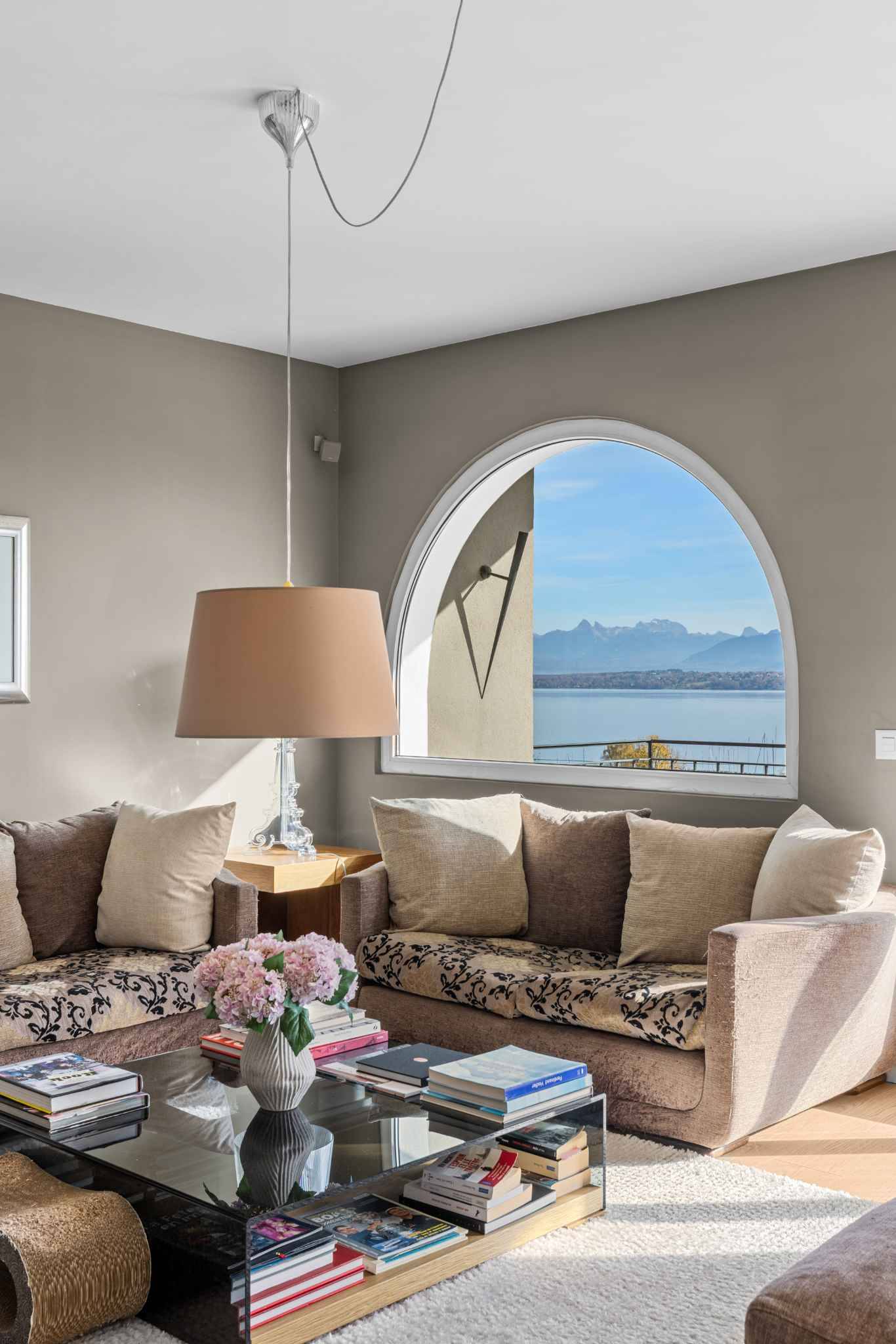 Implantée sur une parcelle de 1’420 m², la propriété développe environ 330 m² de surface utile, dont 240 m² habitables répartis sur deux niveaux. Dès l’entrée, la lumière naturelle structure les volumes et met en valeur les matériaux. Le vaste séjour, équipé d’une cheminée et d’un espace bibliothèque, s’ouvre sur un balcon offrant une vue magistrale sur le lac et les montagnes. La salle à manger et la cuisine moderne avec îlot central prolongent cet espace convivial, avec un accès direct à une grande terrasse couverte, parfaite pour profiter des repas face à un décor unique.