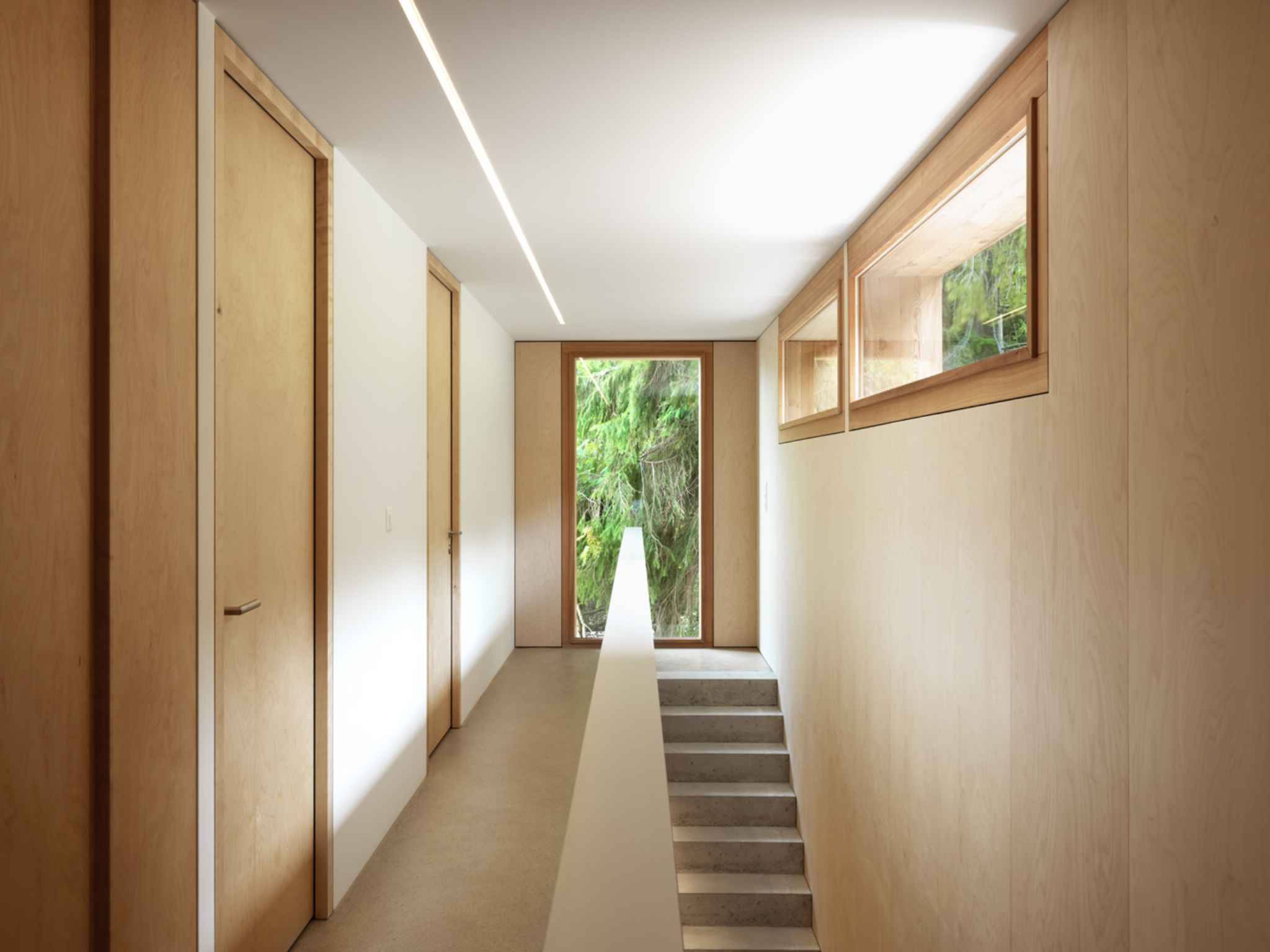 Un escalier double, véritable élément architectural, distribue d’un côté la suite parentale avec salle de bains, et de l’autre un espace réservé aux enfants ou invités avec deux chambres et une salle de bain.