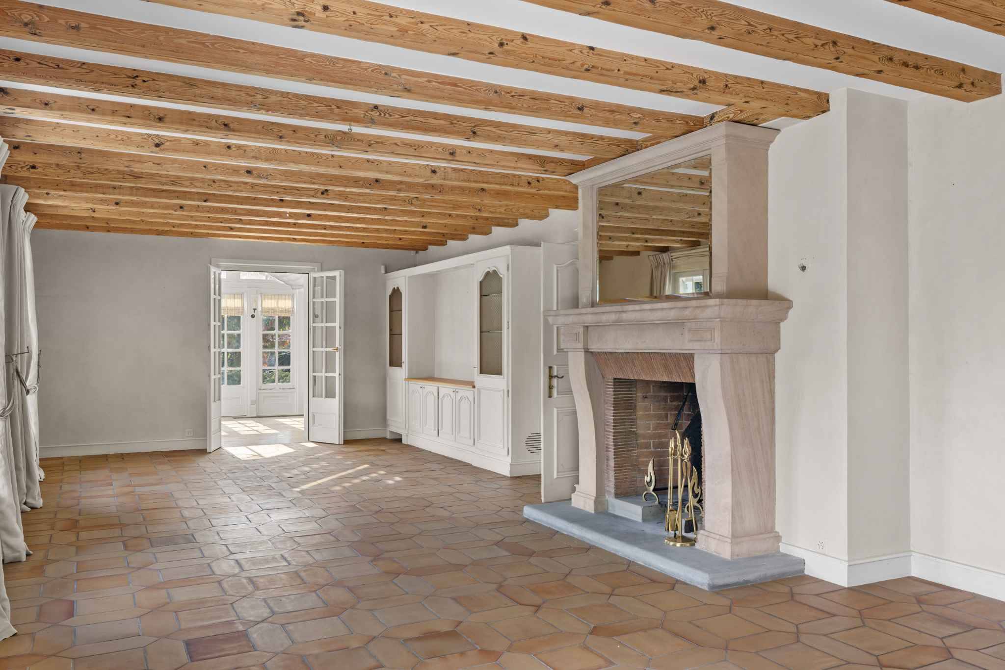 Le rez-de-chaussée accueille un vaste double salon avec cheminée, prolongé par une véranda baignée de lumière, une salle à manger conviviale et une cuisine familiale entièrement équipée avec coin repas. Une chambre avec salle de bains ainsi qu’un WC visiteurs complètent ce niveau. Les pièces de vie s’ouvrent sur de généreuses terrasses exposées plein sud, offrant une vue panoramique sur la campagne et le lac Léman.