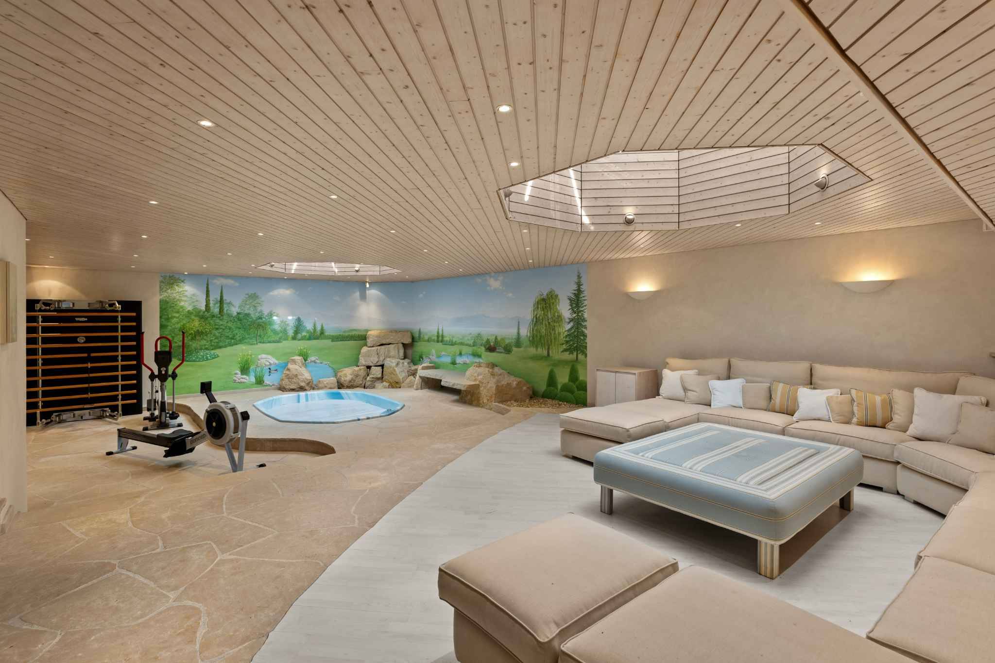 Le sous-sol entièrement aménagé propose un espace bien-être avec spa, hammam et sauna, une cave à vin climatisée, un carnotzet équipé, une buanderie et des locaux techniques.