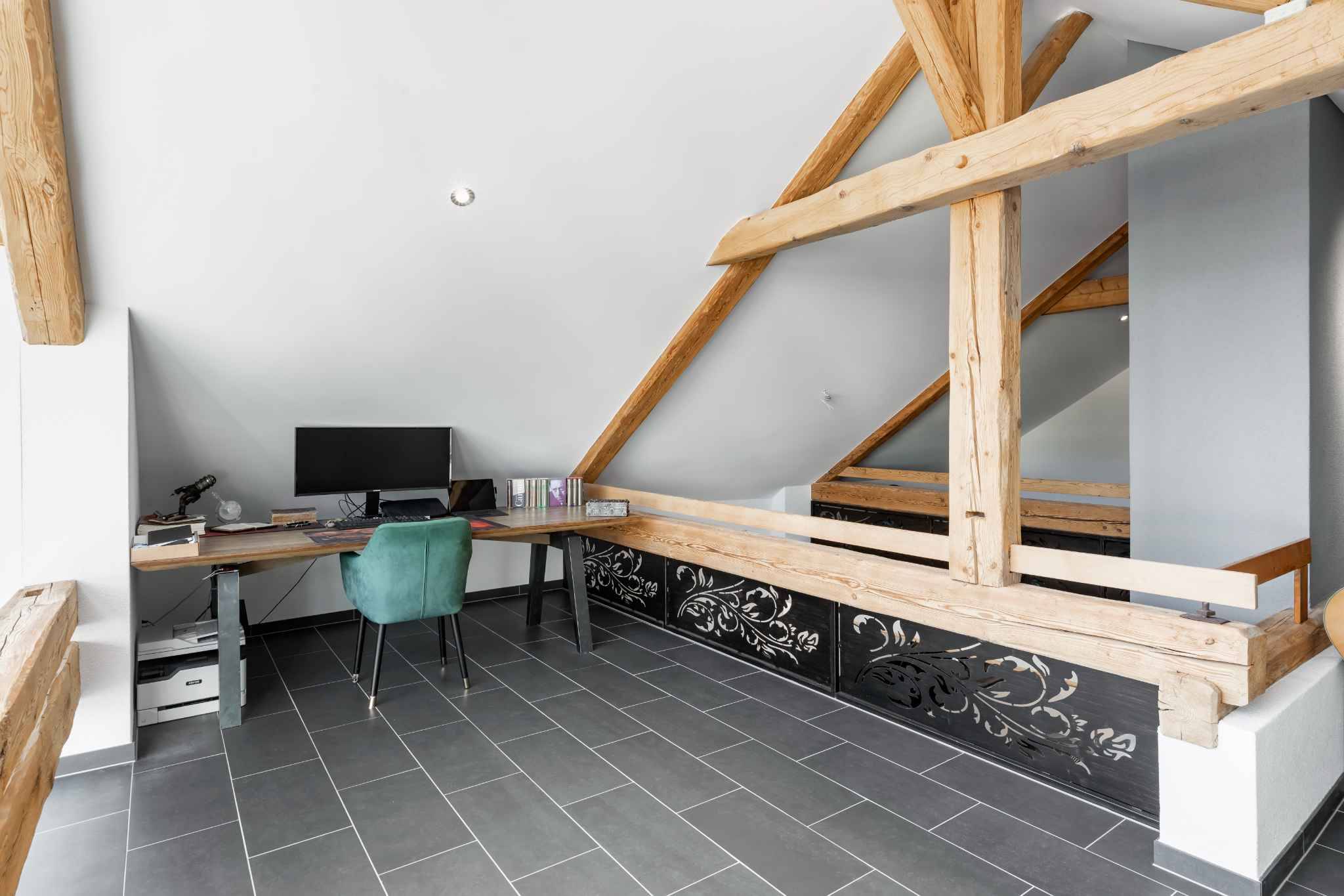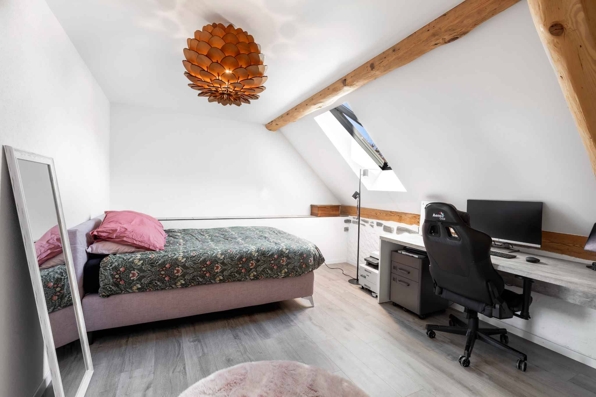 À l’étage, un superbe espace sous toiture avec plafond cathédrale et charpente apparente propose de multiples possibilités d’aménagement : bureau, salon privé ou espace détente selon vos besoins. Une spacieuse chambre parentale avec sa salle de bains attenante vient parfaire cet étage.
