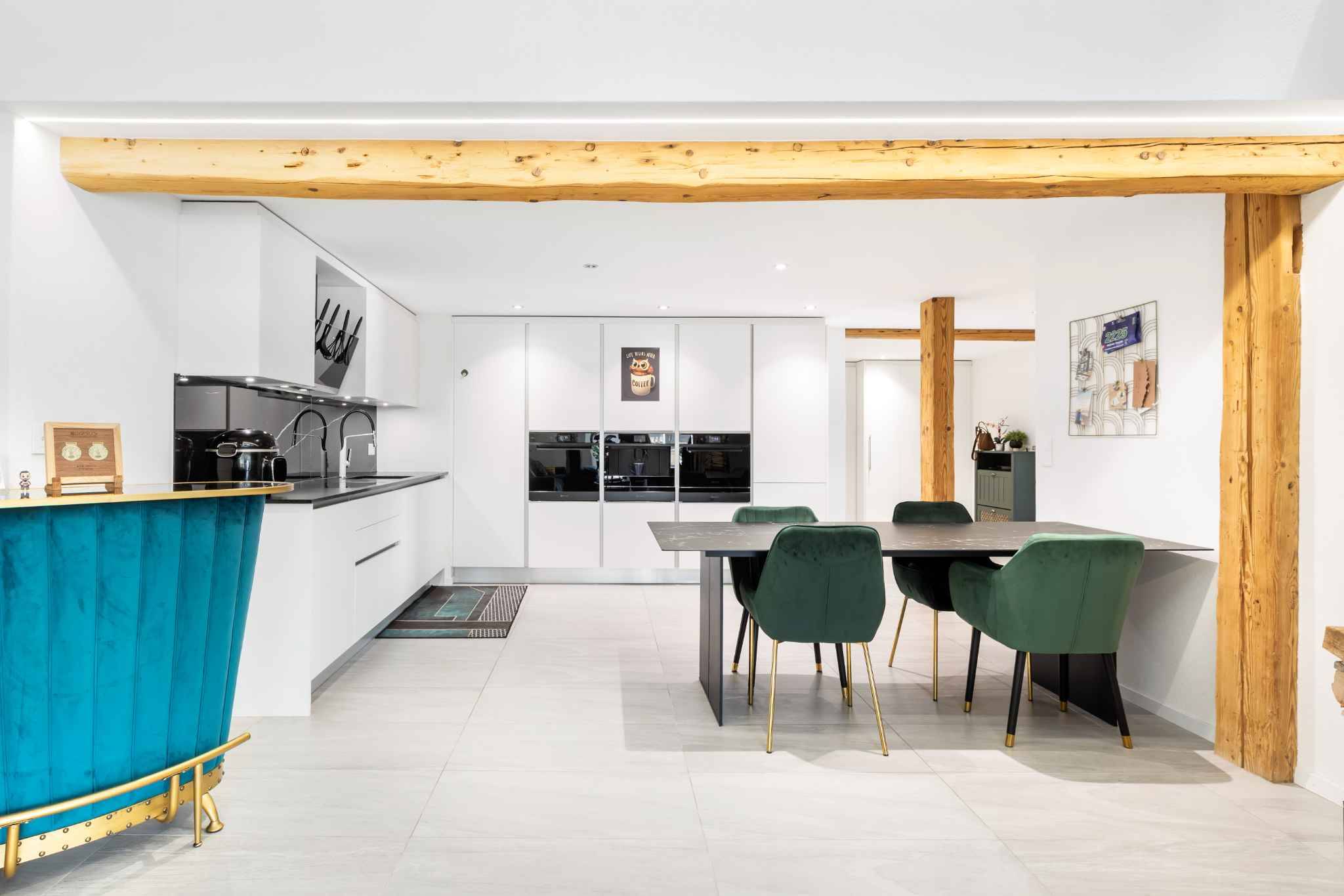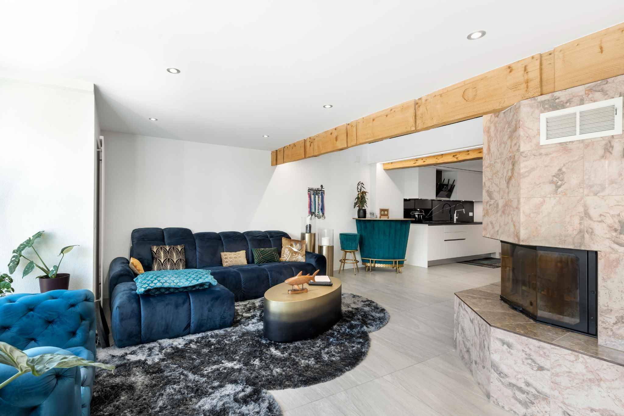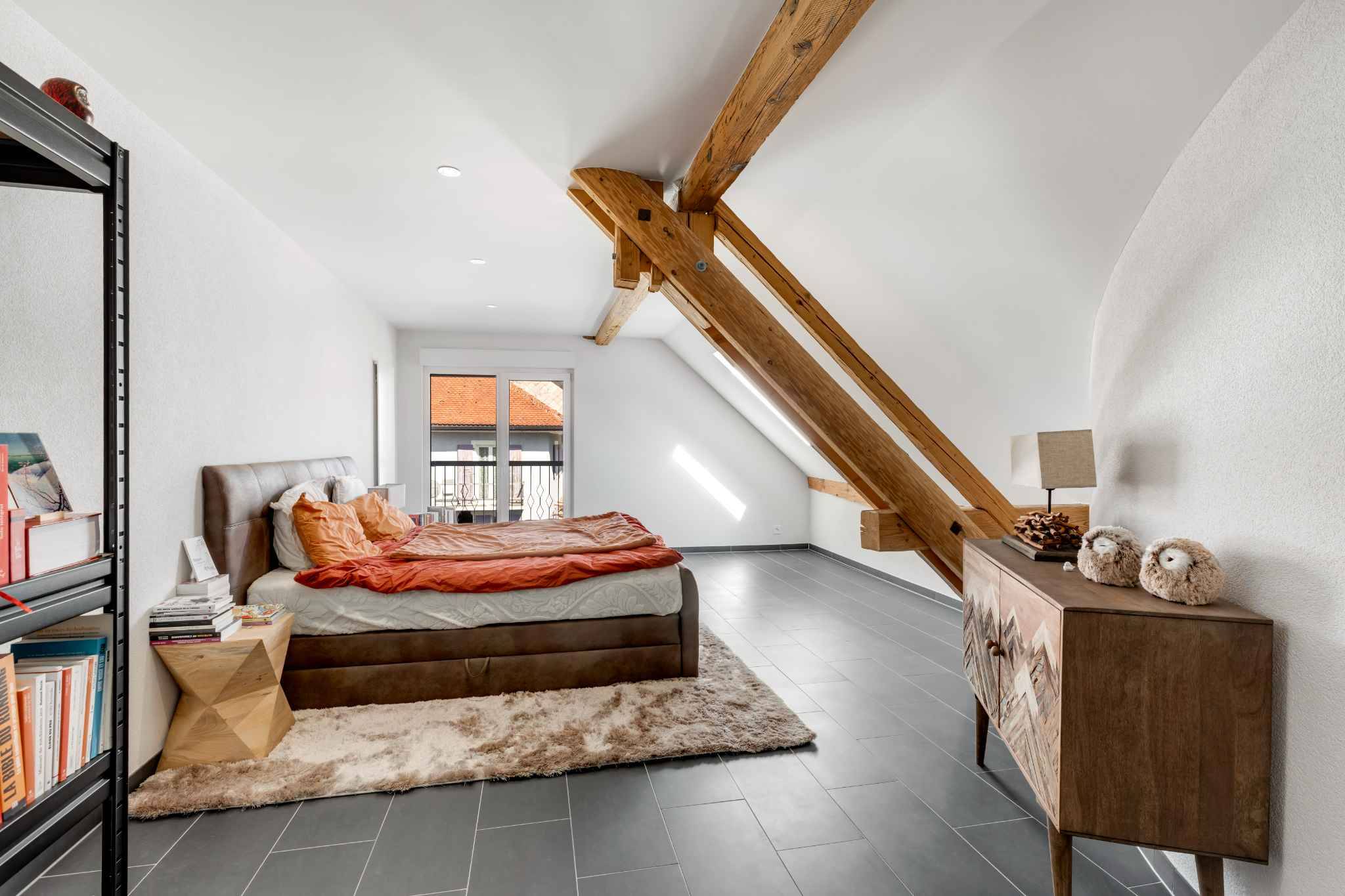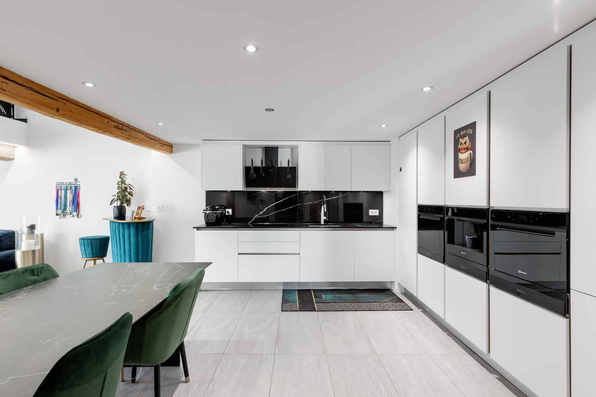 Déployé sur deux niveaux et offrant environ 200 m², l’appartement bénéficie d’une orientation sud-est qui lui assure une belle luminosité tout au long de la journée. Les poutres apparentes et la charpente d’origine ont été soigneusement mises en valeur, créant une atmosphère chaleureuse et authentique.