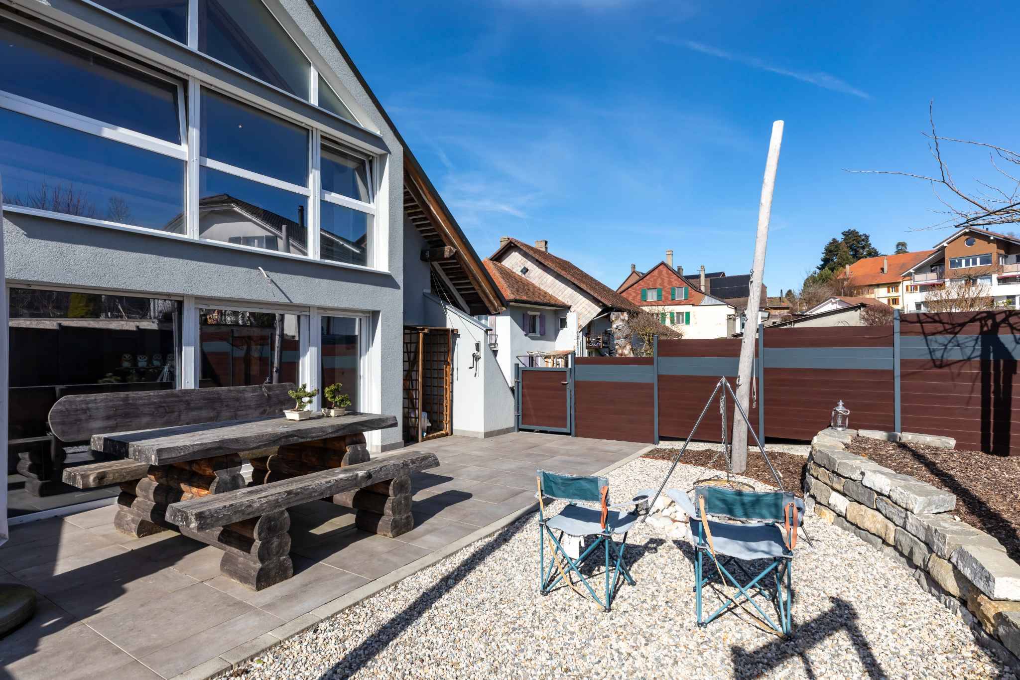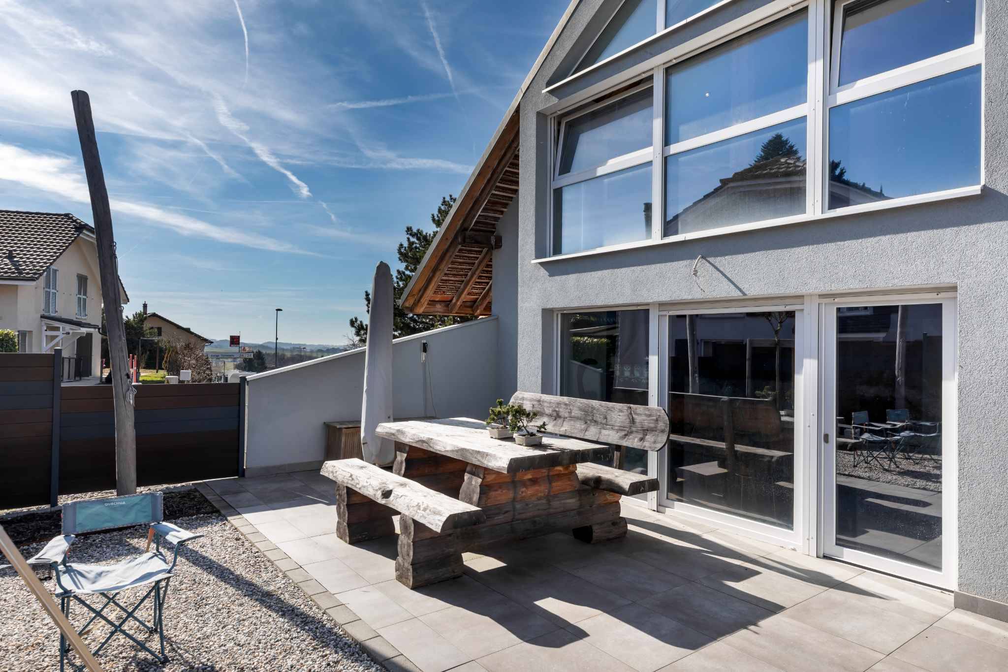 Une grande terrasse aménagée prolonge agréablement l’espace de vie et invite à profiter de moments de détente ou de repas en extérieur dans un cadre paisible.