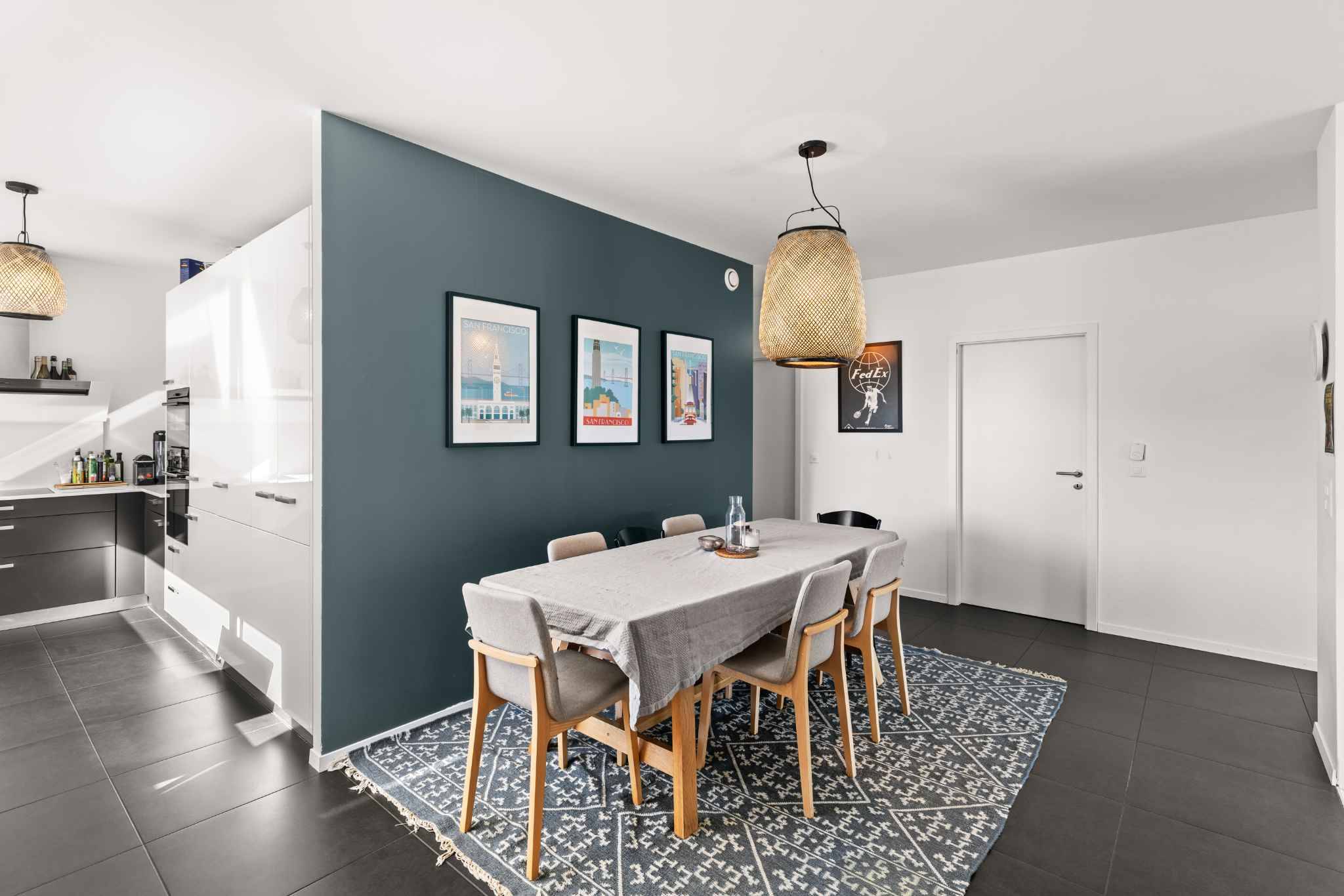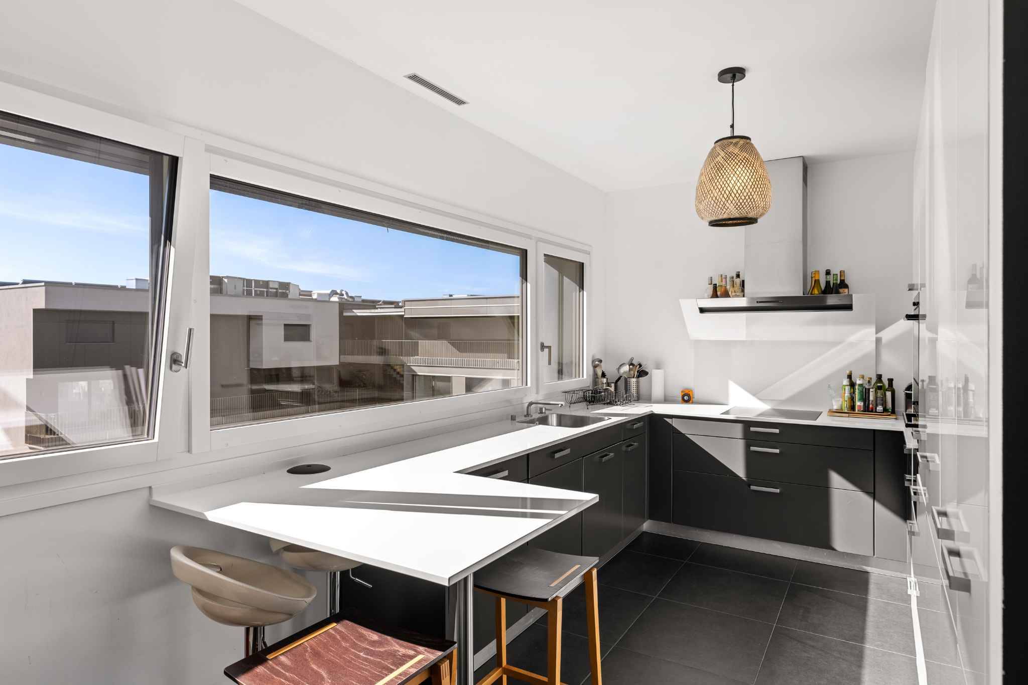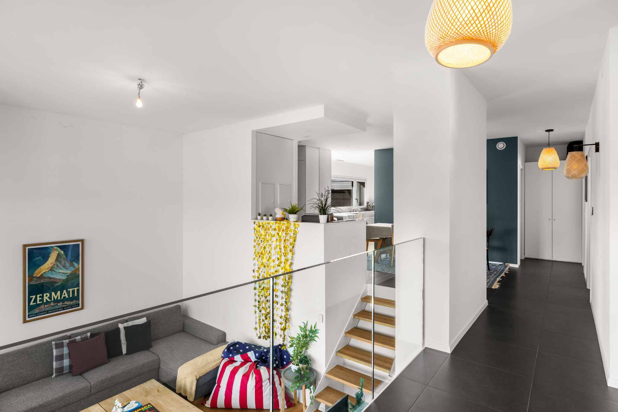 Dès l’entrée, le ton est donné : volumes généreux, finitions soignées, armoires intégrées sur mesure et une atmosphère résolument contemporaine. La pièce de vie impressionne par sa belle hauteur sous plafond et son esprit loft baigné de lumière naturelle. Le séjour et la salle à manger s’ouvrent harmonieusement sur une agréable loggia de 11 m², véritable prolongement extérieur offrant une vue dégagée et inspirante.