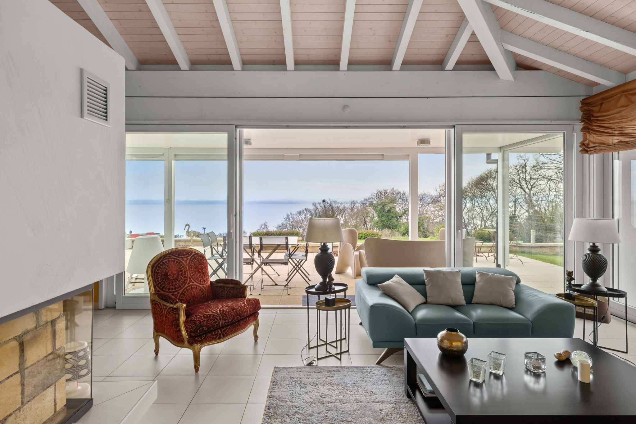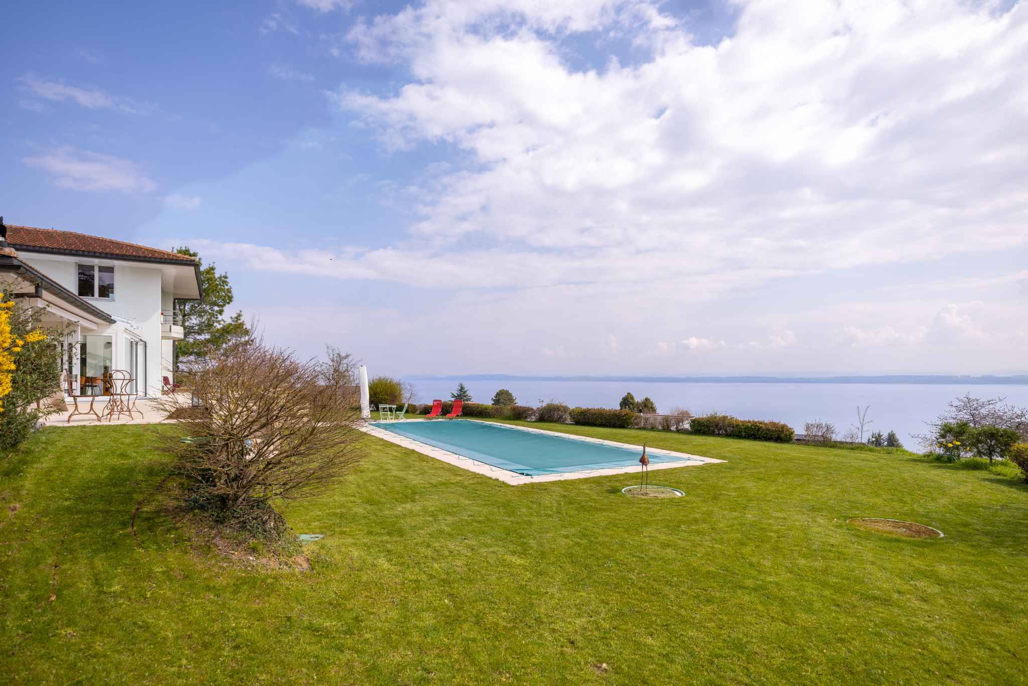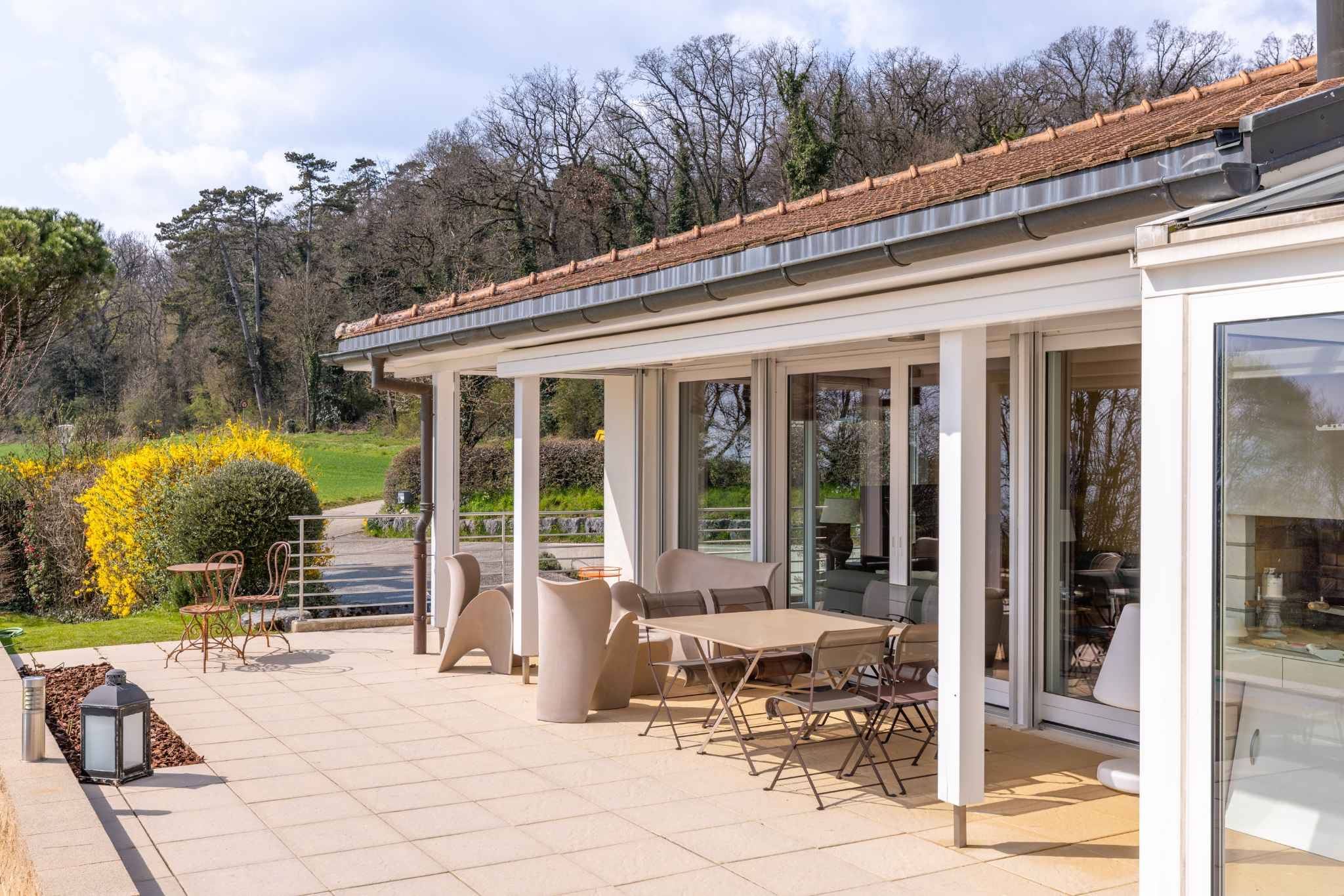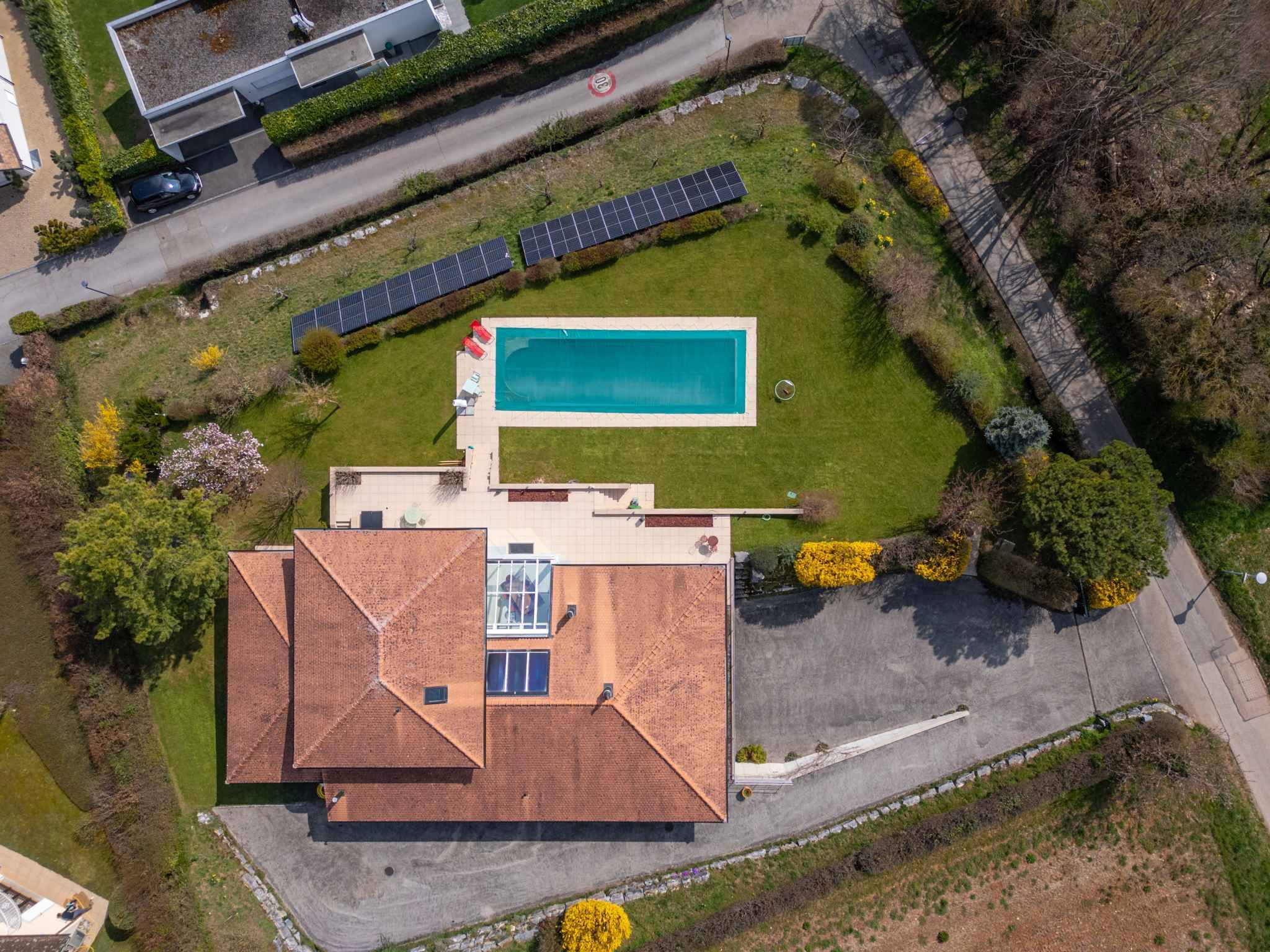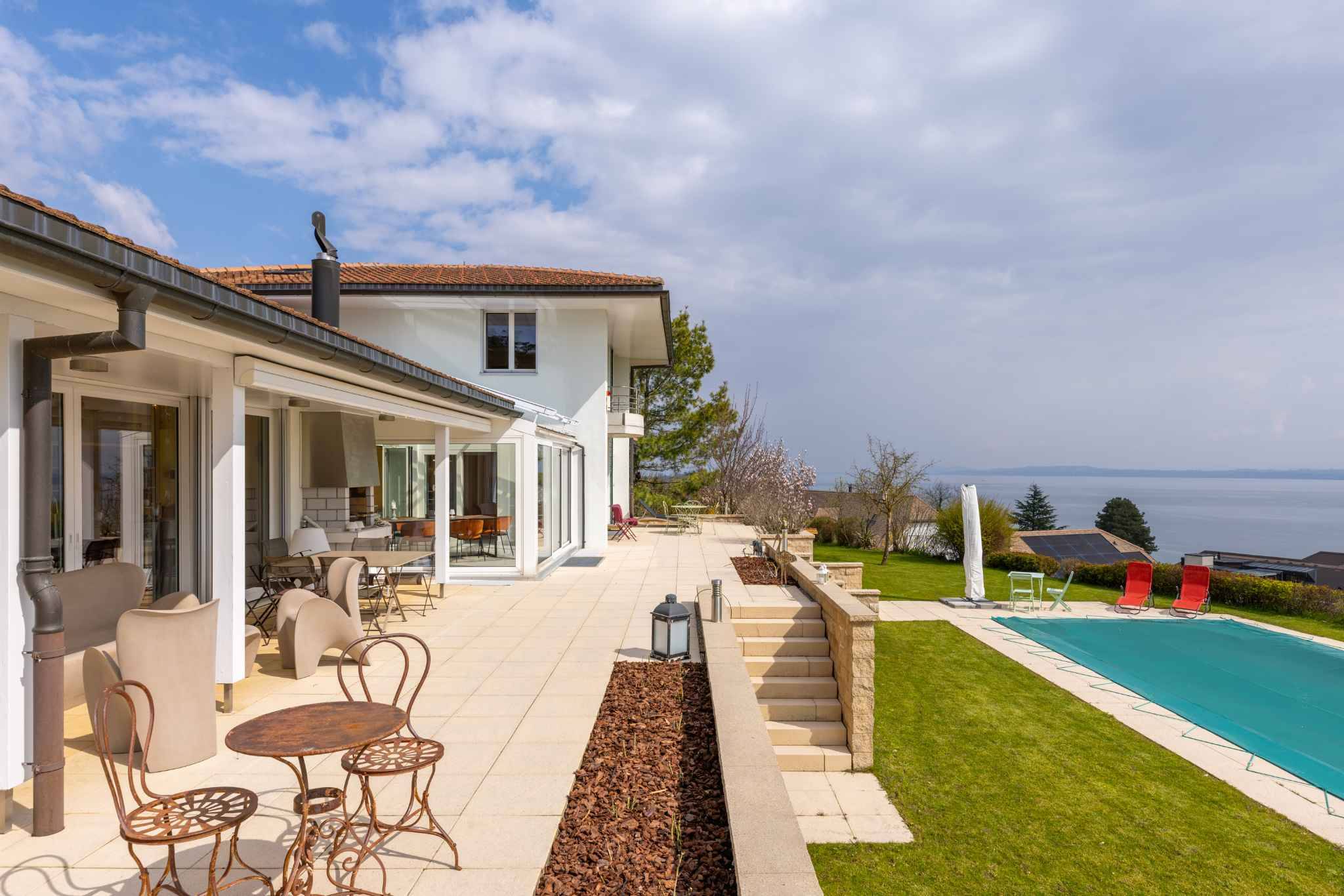 Les extérieurs, soigneusement aménagés, proposent plusieurs espaces terrasses ainsi qu’une piscine parfaitement intégrée à un jardin plat et arboré, offrant un véritable havre de paix à l’abri des regards.