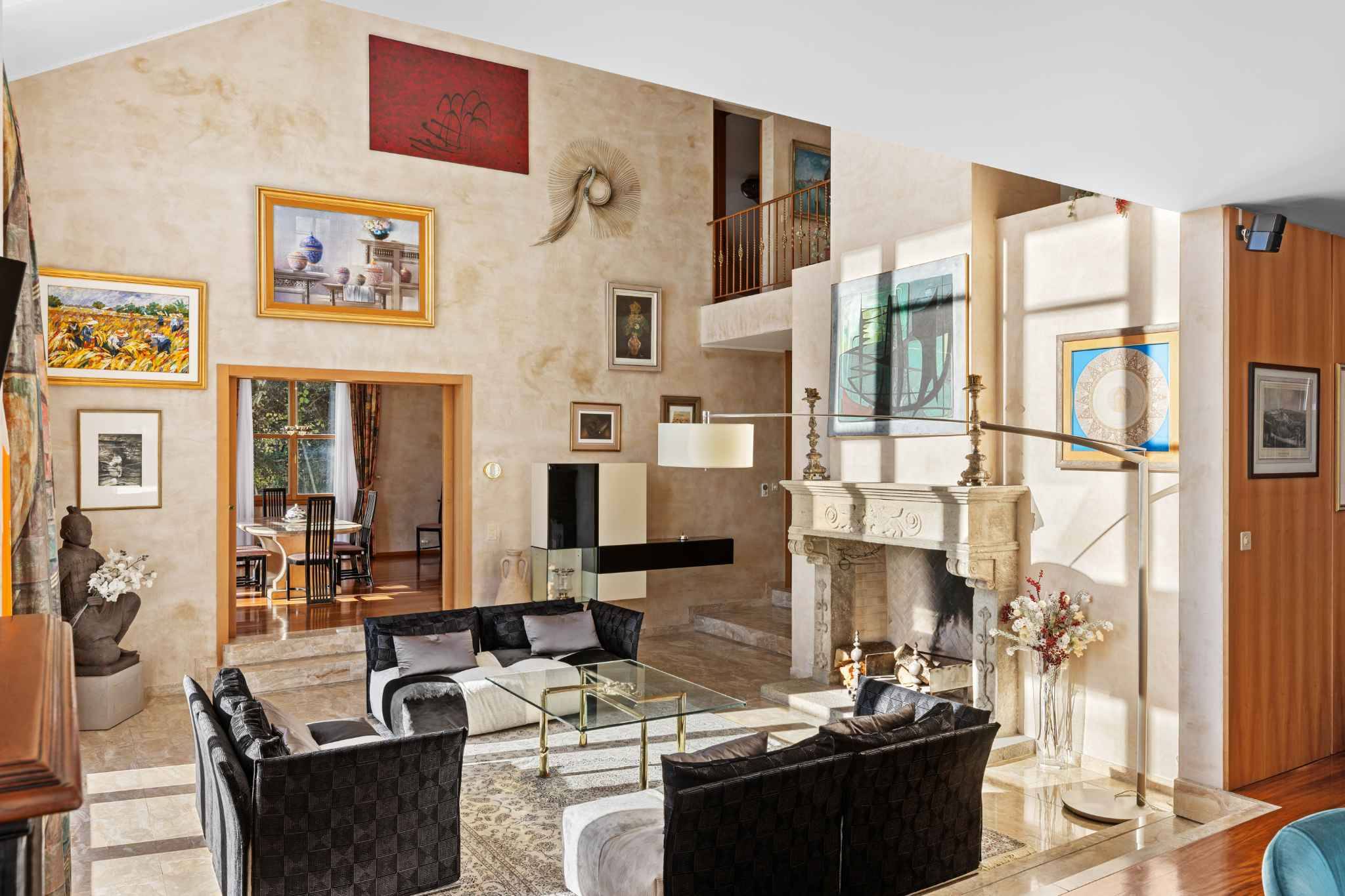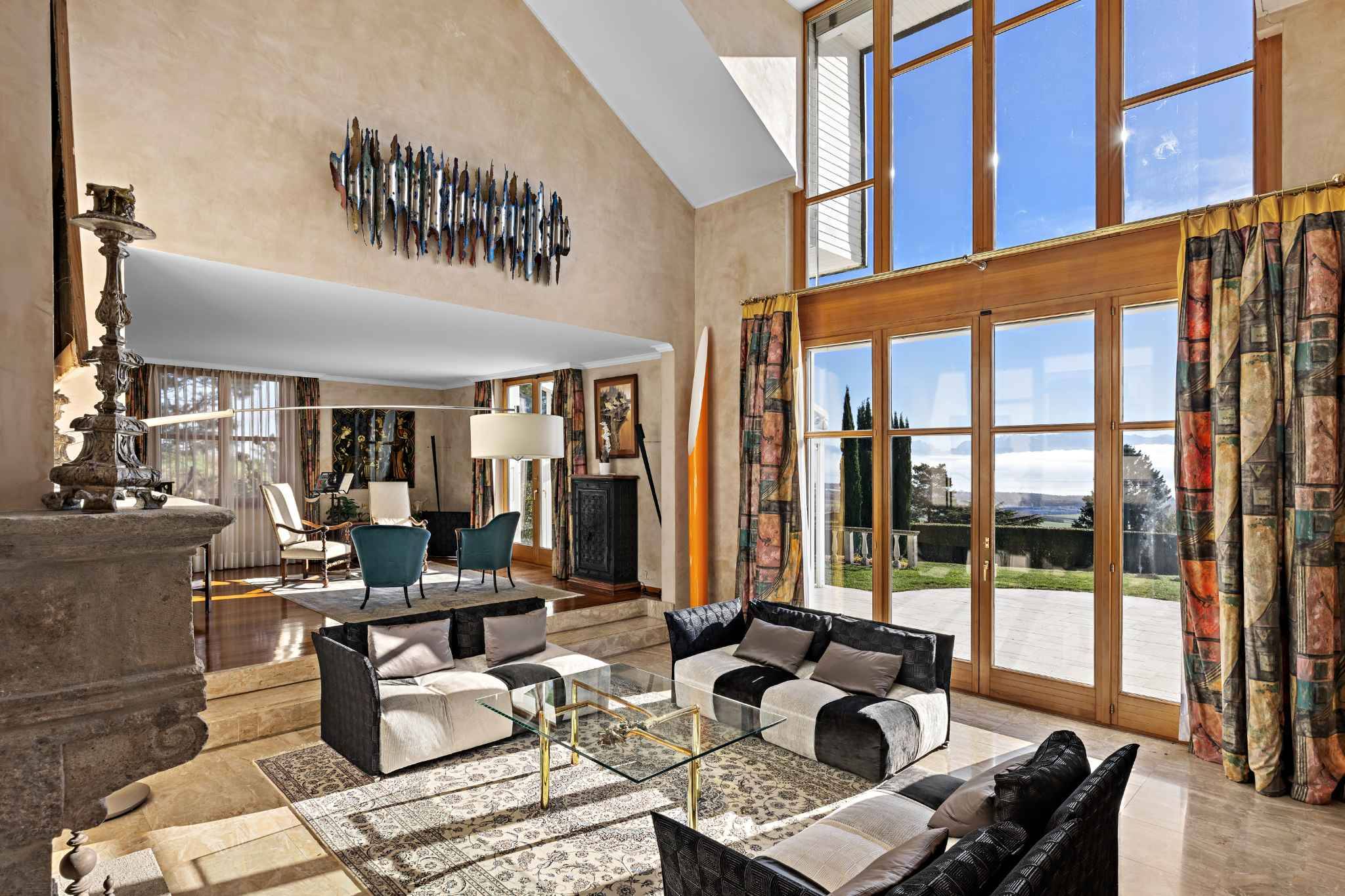 Les espaces de vie sont spacieux et lumineux : un salon de réception orné d’une impressionnante cheminée du XVe siècle, un salon TV convivial et une salle à manger raffinée. Les larges baies vitrées orientées plein sud inondent les pièces de lumière et permettent de profiter d’une vue imprenable sur le lac depuis presque toutes les pièces.